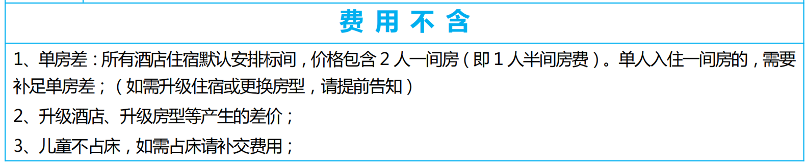 3、根据国家旅游局相关规定,因客人自身原因在旅游期间未能完成旅游活动或提前离团、弃团,将被视为自动 放弃费用不予退还,若在离团期间放生意外事故等我社不承担任何责任。